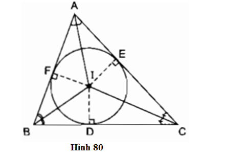 Cho tam giác ABC. Gọi I là giao điểm của các đường phân giác các góc trong của tam giác; D, E, F theo thứ tự là chân các đường vuông góc kẻ từ I đến các cạnh BC, AC, AB (h.80). Chứng minh rằng ba điểm D, E, F nằm trên cùng một đường tròn tâm I.
