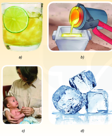 Trong các nhiệt độ sau: 0<sup>0</sup>C; 5<sup>0</sup>C; 36,5<sup>0</sup>C; 327<sup>0</sup>C. Hãy chọn nhiệt độ thích hợp cho mỗi trường hợp ở hình 8.2.