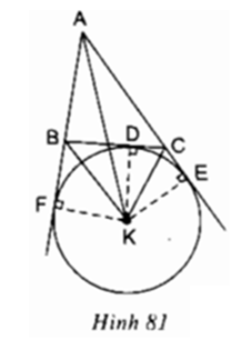 Cho tam giác ABC, K là giao điểm các đường phân giác của hai góc ngoài tại B và C; D, E, F theo thứ tự là chân các đường vuông góc kẻ từ K đến các đường thẳng BC, AC, AB (h.81). Chứng minh rằng ba điểm D, E, F năm trên cùng một đường tròn có tâm K.