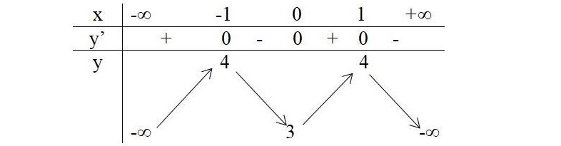 \(y =  – 4{x^3}\; + {\rm{ }}4x.\) Cho \(y’ = 0 ⇒ x = 0\) hoặc \(x = ±1.\)