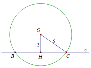 \(\eqalign{& HC = \sqrt {O{C^2} – O{H^2}}  = \sqrt {{5^2} – {3^2}}  = 4\,\,\left( {cm} \right)  \cr &  \Rightarrow BC = 2HC = 8\left( {cm} \right) \cr} \)