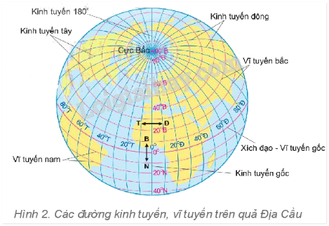 Dựa vào hình 2 và đọc thông tin mục 1, em hãy: 1. Xác định đường kinh tuyến gốc và vĩ tuyến gôc. Cho biết thế nào là kinh tuyến tây, kinh tuyến đông, vĩ tuyến bắc, vĩ tuyến nam. 2. So sánh độ dài giữa các kinh tuyến với nhau và độ dài giữa các vĩ tuyến với nhau.