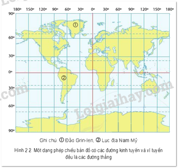 – Hình 2.2: Phép chiếu bản đồ có các đường kinh tuyến và vĩ tuyến đều là các đường thẳng thì diện tích đảo Grin-len nhỏ hơn không đáng kể so với lục địa Nam Mỹ.