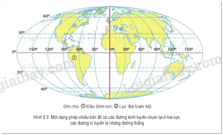 – Hình 2.3: Phép chiếu bản đồ có các đường kinh tuyến là những đường cong chụm lại ở hai cực, các đường vĩ tuyến là những đường thẳng song song với nhau thì ta thấy diện tích đảo Grin-len nhỏ hơn rất nhiều so với lục địa Nam Mỹ.