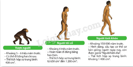 + Người tối cổ: sinh sống khoảng 4 triệu năm trước, hoàn toàn đứng bằng hai chân, thể tích hộp sọ trung bình từ 650m3 đến 1200cm3.