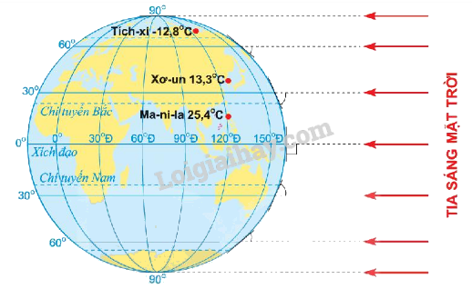+ Càng lên gần cực, góc chiếu của tia sáng mặt trời càng nhỏ, mặt đất nhận được ít nhiệt hơn, không khí trên mặt đất cũng ít nóng hơn: Xơ-un (vĩ độ trung bình), Tích-xi (vĩ độ cao) nên nhiệt độ trung bình năm của không khí thấp dần.