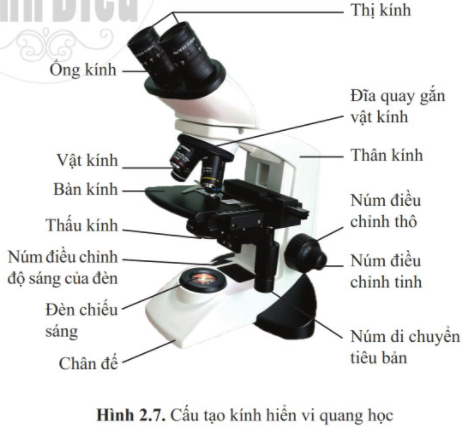 Hãy quan sát hình 2.7 và cho biết tác dụng của các bộ phận chính trong kính hiển vi quang học.