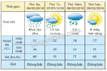 – Mô tả đặc điểm thời tiết của từng ngày trong bảng.