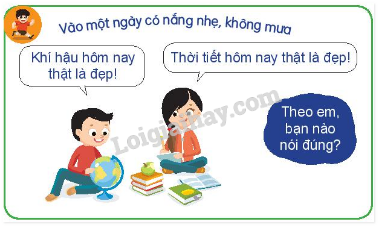 – Giải thích: “Vào một ngày có nắng nhẹ, không mưa” – là trạng thái của khí quyển diễn ra trong khoảng 1 ngày và có thể thay đổi vào hôm sau => Thời tiết.