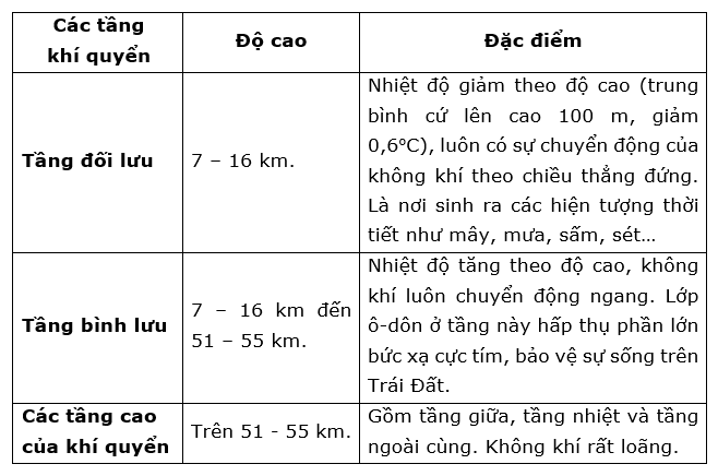 1. Đọc thông tin và quan sát hình 13.1, hãy lập bảng mô tả đặc điểm của các tầng khí quyển.