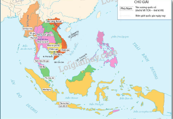 Hình 10.2. Lược đồ các vương quốc Đông Nam Á (từ thế kỉ VII TCN đến thế kỉ VII)