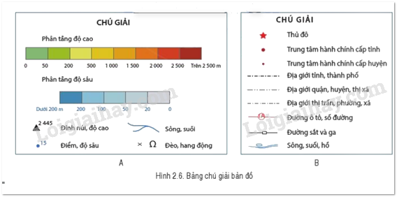 – Quan sát hình 2.6A và hình 2.6B hãy cho biết yếu tố địa hình được thể hiện trên bảng chú giải nào.