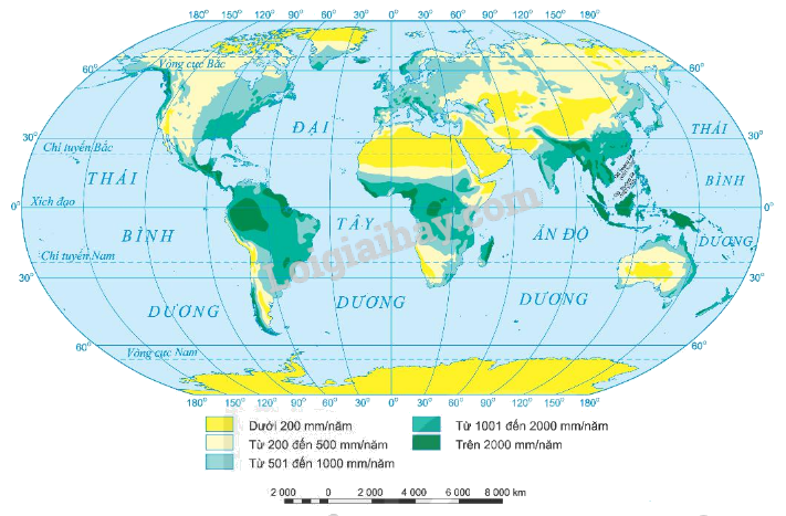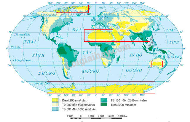 – Những vùng có lượng mưa trung bình năm dưới 200 mm (khu vực chí tuyến và vùng cực): phía bắc đảo Grơn-len và các đảo nhỏ khu vực Bắc Mỹ, phía tây và trung Á, Bắc Phi, nội địa Ô-xtrây-li-a, Nam Cực.