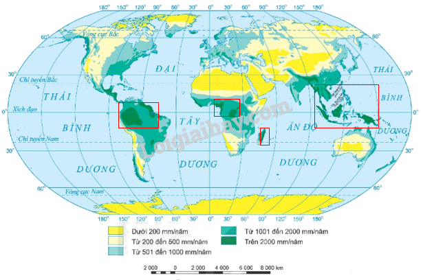 – Những vùng có lượng mưa trung bình năm trên 2 000 mm (khu vực Xích đạo): phía tây bắc và phía bắc Nam Mỹ, phía tây Trung Phi, phía đông đảo Ma-đa-ga-xca, Đông Nam Á.