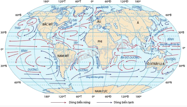 – Dòng biển nóng thường xuất phát từ Xích đạo (0o) và di chuyển đến khoảng vĩ độ 60o (ở cả 2 bán cầu).