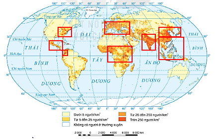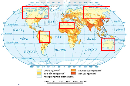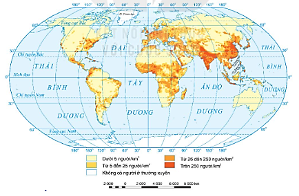 – Xác định các khu vực trên thế giới có mật độ dân số trên 250 người/kmvà các khu vực có mật độ dân số dưới 5 người/km2.