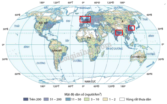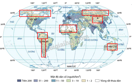 – Xác định những khu vực có mật độ dân số từ 1 đến 2 người/km2 và những khu vực có mật độ dân số trên 200 người/km2