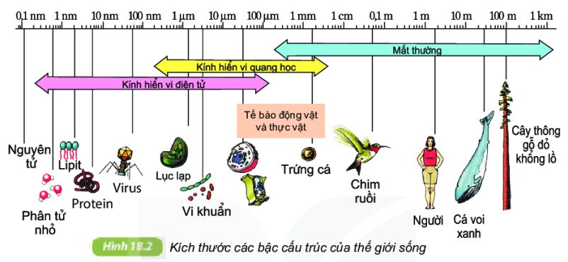 Quan sát kích thước tế bào vi khuẩn, tế bào động vật, tế bào thực vật trong hình 18.2 và cho biết tế bào nào có thể quan sát bằng mắt thường, tế bào nào phải quan sát bằng kính hiển vi?
