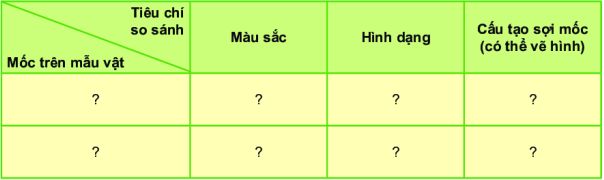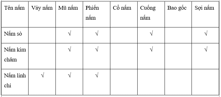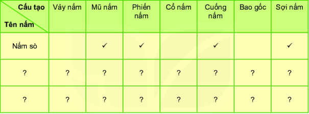 Dựa vào kết quả quan sát các thành phần cấu tạo của mỗi mẫu nấm đã chuẩn bị, em hãy hoàn thành bảng theo mẫu dưới đây: