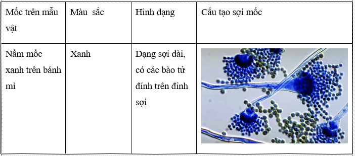 Mô tả các loại nấm mốc trên mẫu vật đã chuẩn bị theo các tiêu chí trong bảng sau.