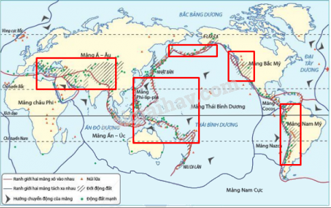 Hình 9.3. Lược đồ các mảng kiến tạo lớn và cách vành đai núi lửa, động đất trên Trái Đất