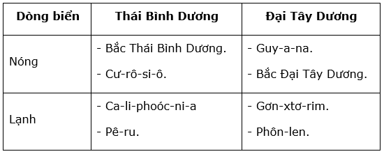 2. Dựa vào hình 3, em hãy kể tên hai dòng biển nóng và hai dòng biển lạnh ở Thái Bình Dương và Đại Tây Dương.