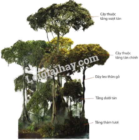 – Cấu trúc của rừng nhiệt đới từ thấp đến cao: Tầng thảm lưới -> Tầng dưới tán -> Dây leo thân gỗ -> Cây thuộc tầng tán chính -> Cây thuộc tầng vượt tán.