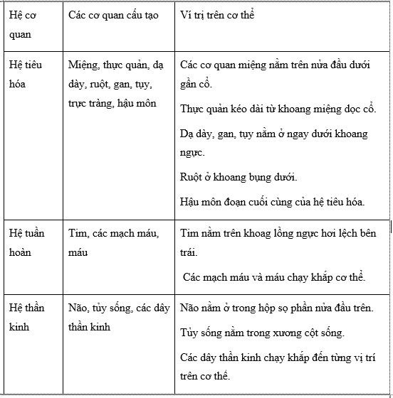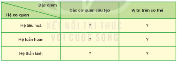 Dựa vào kết quả quan sát mô hình hoặc tranh, ảnh một số hệ cơ quan trong cơ thể người, hoàn thành bảng theo mẫu sau:
