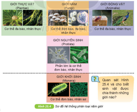Quan sát hình 25.4 và cho biết sinh vật được chia thành những giới nào?