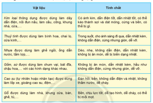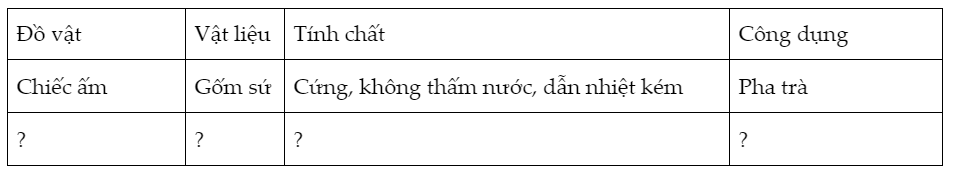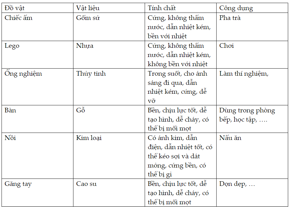 1. Để làm chiếc ấm điện đun nước, người ta đã sử dụng các vật liệu gì? Giải thích 2. Quan sát các đồ vật trong hình bên rồi ghi nhận xét theo mẫu bảng sau: 3. Hãy cho biết cách sử dụng một số đồ dùng gia đình sao cho an toàn (tránh bị bỏng, điện giật, …)