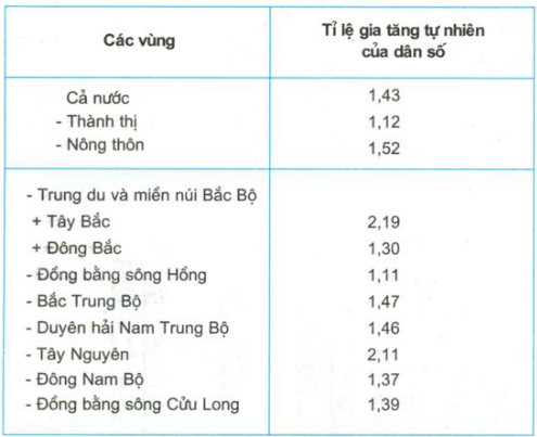 – Các vùng lãnh thổ có tỉ lệ gia tăng tự nhiên của dân số cao hơn trung bình cả nước (1,43%) là: Tây Bắc (2,19%), Bắc Trung Bộ (1,47%), Duyên hải Nam Trung Bộ (1,46%), Tây Nguyên (2,11%).