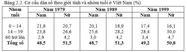 + Tỉ lệ nhóm dân số nữ giảm trong cơ cấu dân số theo giới từ 51,5% (1979) xuống 50,8% (1999).