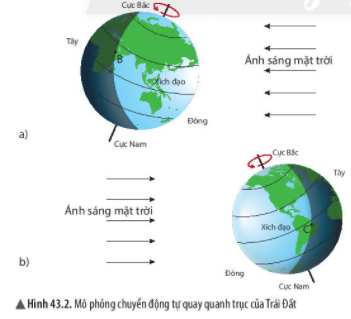 Quan sát hình 43.2, em hãy cho biết Trái Đất tự quay quanh trục của nó theo chiều nào vào mỗi thời điểm, ánh sáng Mặt Trời chiếu tới Trái Đất sẽ làm bao nhiêu phần diện tích mặt đất được chiếu sáng?