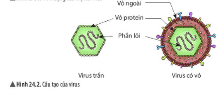 Quan sát hình 24.2, nêu cấu tạo của virus. Cấu tạo của virus có gì khác so với cấu tạo của tế bào sinh vật nhân sơ và nhân thực mà em đã được học?