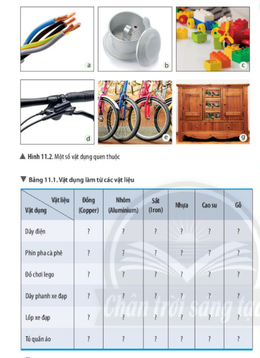 Quan sát mẩu dây điện, phin pha cà phê, dây phanh xe đạp, lốp (vỏ) xe đạp, tủ quần áo và đồ chơi lego ở hình 11.2, em hãy cho biết các sản phẩm đó được làm từ vật liệu gì? Tích dấu để hoàn thành theo mẫu bảng 11.1