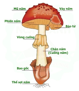Nấm túi: các bào tử mọc phía trên mũ nấm.