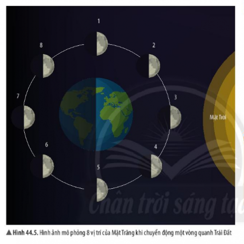 Với mỗi vị trí của Mặt Trăng trong hình 44.5, người trên Trái Đất quan sát thấy Mặt Trăng có hình dạng như thế nào? Chỉ ra sự tương ứng giữa mỗi vị trí với các hình dạng nhìn thấy của Mặt Trăng trong hình 44.3