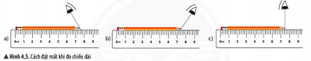 Quan sát hình 4.5 và cho biết cách đặt mắt để đọc chiều dài bút chì như thế nào là đúng?
