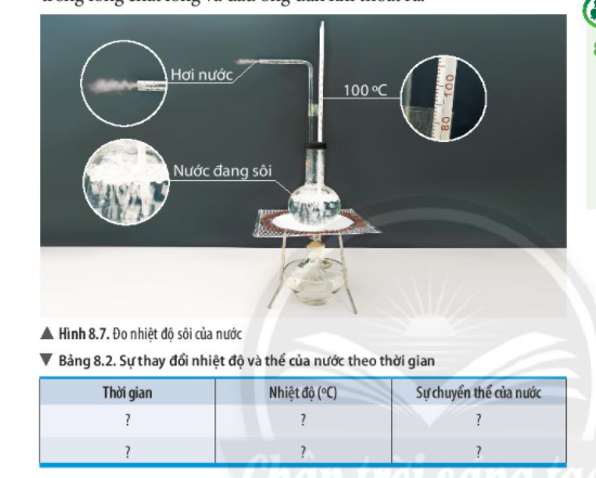 Thực hiện thí nghiệm 1 (hình 8.7) và ghi kết quả sự thay đổi nhiệt độ hiển thị trên nhiệt kết sau mỗi phút theo mẫu bảng 8.2. Trong suốt thời gian nước sôi, nhiệt độ của nước có thay đổi không?