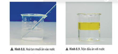 Từ thí nghiệm 2 (hình 8.8 và 8.9), em có nhận xét gì về khả năng tan của muối ăn và dầu ăn trong nước.