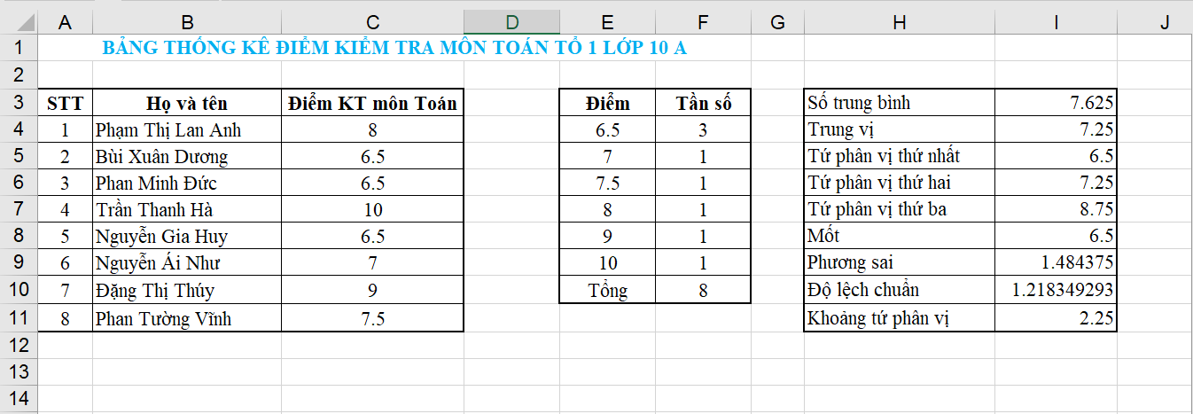 Chia lớp theo tổ để phân công làm thống kê như trên đối với điểm kiểm tra môn Toán của lớp và tổng hợp các kết quả trong một văn bản hoặc trang trình chiếu. Làm tương tự với điểm kiểm tra các môn học khác của lớp