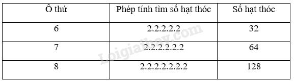 Bảng sau đây chỉ ra cách tính số hạt thóc ở một số ô trong bàn cờ trong bài toán mở đầu: