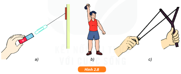 Hãy vẽ các mũi tên biểu diễn các lực ở hìmh dưới, biết: a) Lực của nam châm tác dụng lên kẹp giấy (0,5 N). b) Lực của lực sĩ tác dụng lên quả tạ (50 N). c) Lực của dây cao su tác dụng lên viên đạn đất (mỗi giây 6 N). (Với mỗi trường hợp phải nêu rõ tỉ xích đã chọn cho độ lớn của lực).