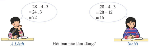 Hai bạn A Lềnh và Su Ni tính giá trị của biểu thức 28 – 4.3 như sau: