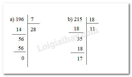 Thực hiện các phép chia 196 :7 và 215 : 18.