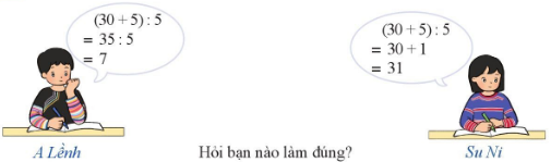 Hai bạn A Lềnh và Su Ni tính giá trị của biểu thức \(\left( {30 + 5} \right):5\) như sau: