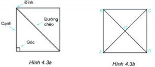 1. Nêu tên các đỉnh, cạnh, đường chéo của hình vuông ABCD (h.4.3b).