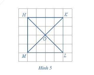 Với hình vuông HKLM ở hình 5, thực hiện hoạt động sau:a) Đếm số ô vuông để so sánh độ dài các cạnh HK, KL, LM, MH b) Quan sát xem các cạnh đối HK và ML, HM và KL của hình vuông HKLM có song song với nhau không. c) Đếm số ô vuông để so sánh độ dài hai đường chéo KM và HL. d) Nêu đặc điểm bốn góc ở các tỉnh H, K, L, M.