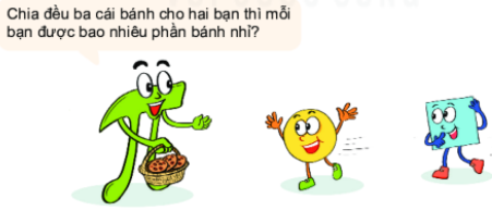 Có 3 cái bánh nên tử số là 3. Chia đều cho 2 bạn nên mẫu số là 2. Vậy phân số biểu thị phần bánh mỗi bạn là: \(\dfrac{3}{2}\).