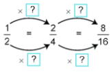 a)Cho biết các phân số sau có bằng nhau không? b) Thay các dấu “?” trong hình dưới bằng số thích hợp rồi rút ra nhận xét.